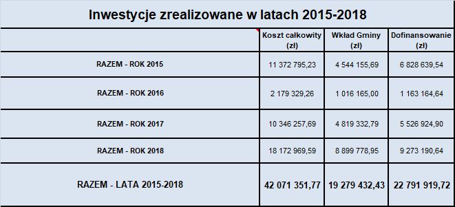 Przedstawiamy Państwu podsumowanie inwestycji zrealizowanych w latach 2015-2018. Kilka zadań jest jeszcze w trakcie realizacji. Do pobrania pełne zestawienie, zawierające aż 90 pozycji.