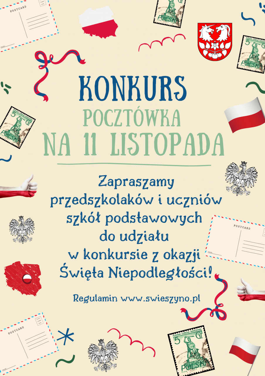 Serdecznie zapraszamy wszystkich przedszkolaków i uczniów szkół podstawowych z terenu Gminy Świeszyno do wzięcia udziału w konkursie plastycznym „Pocztówka na 11 listopada"!