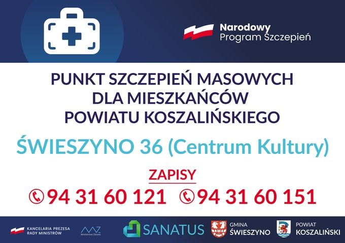 Gorąco zapraszamy do Punktu Szczepień Powszechnych w Świeszynie. Pamiętajmy, że zaszczepione społeczeństwo to zdrowe społeczeństwo.