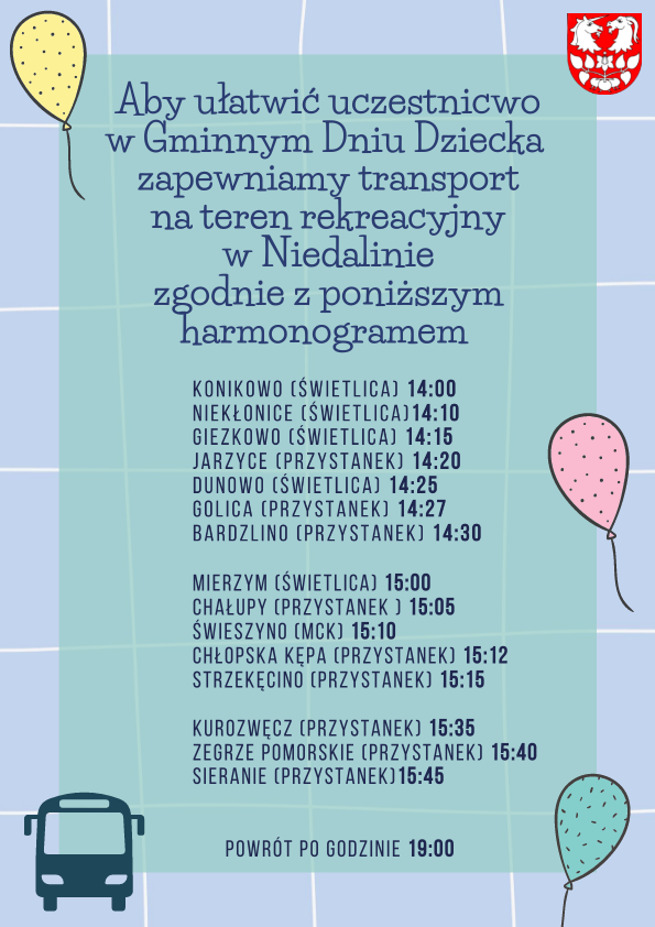 Szanowni Państwo, przedstawiamy harmonogram zorganiozwanego transportu na festyn z okazji Dnia Dziecka i Nocy Świętojańskiej, który odbędzie się w sobotę 19 czerwca na terenie rekreacyjnym w Niedalinie.